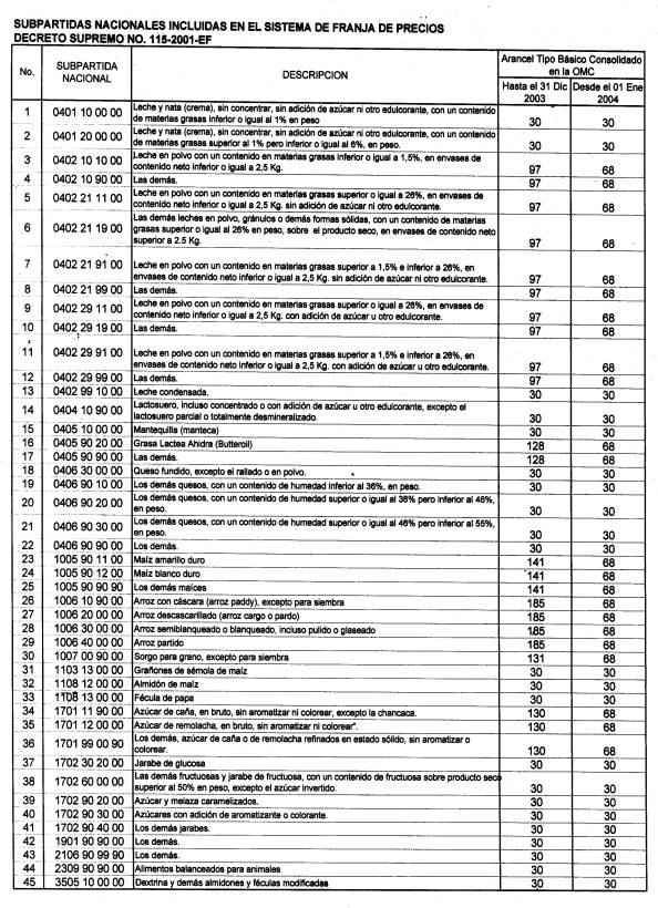 Sistemas de Franja de Precios - Arancel Básico OMC para la aplicación del Art. 4º del DS. Nº 153-2002-EF. ARANCEL TIPO BASICO CONSOLIDADO POR EL PERU ANTE LA ORGANIZACIÓN MUNDIAL DE COMERCIO PARA LAS SUBPARTIDAS NACIONALES INCLUIDAS EN EL SISTEMA DE FRANJAS DE PRECIOS. (D.S.N°153-EF-2002 del 27.09.2002)