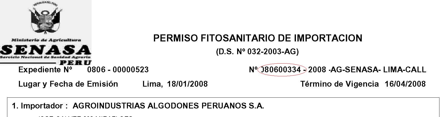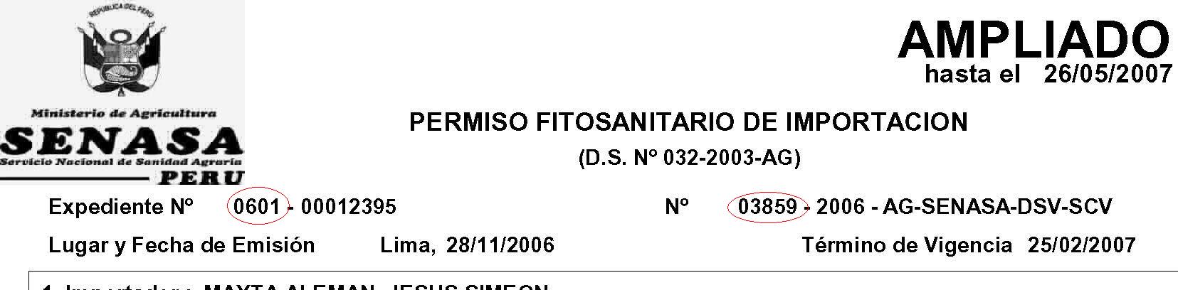 El número que se debe de reportar ante SUNAT es la unión de los 4 primeros dígitos del número de expediente con el número de Permiso, para este caso 060103859, el cual debe de ir precedido del 01, por consiguiente, el número a enviar por Teledespacho es: 01060103859. 2) PARA LOS PERMISOS SENASA CON CODIFICACIÓN A 9 DÍGITOS: